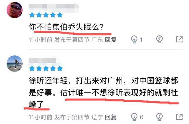 考慮到上一場廣東隊的比賽,杜鋒在賽后回應陳家政為何上場機會不多的那番言論,廣東球迷看到徐昕在廣州打得如此出色,也開始調(diào)侃起來:“如果你在廣東就會在發(fā)布會聽到,徐昕打得不錯,但是換下誰?”