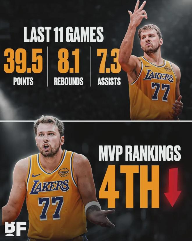 北京時間3月28日,NBA常規(guī)賽:湖人主場116-99戰(zhàn)勝籃網(wǎng)。東契奇投籃25中15,三分10中5,罰球6中6,狂砍41分8板3助3斷1帽。最近12場比賽,湖人11勝1負。但是,今天NBA官網(wǎng)公布MVP排行榜,東契奇從第二跌至第四。