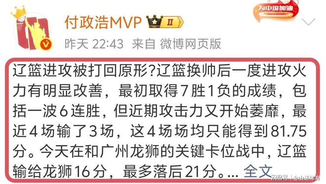 賽后,媒體人付政浩發(fā)文表示:遼籃進(jìn)攻被打回原形?遼籃換帥后一度進(jìn)攻火力有明顯改善,最初取得7勝1負(fù)的成績,包括一波6連勝,但近期攻擊力又開始萎靡,最近4場輸了3場,這4場場均只能得到81.75分。今天在和廣州龍獅的關(guān)鍵卡位戰(zhàn)中,遼籃輸給龍獅16分,最多落后21分。遼籃本場輸龍獅和上一場輸吉林男籃如出一轍,內(nèi)外線對(duì)位都處于劣勢(shì),有些招架不住、力不從心……