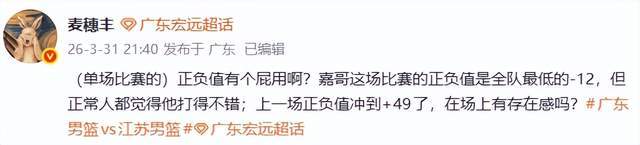 廣東男籃完成復(fù)仇,廣東媒體人麥穗豐老師也站出來(lái)為備受質(zhì)疑的張皓嘉發(fā)聲了,他在社交平臺(tái)公開發(fā)聲,“(單場(chǎng)比賽的)正負(fù)值有個(gè)屁用???嘉哥這場(chǎng)比賽的正負(fù)值是全隊(duì)最低的-12,但正常人都覺得他打得不錯(cuò);上一場(chǎng)正負(fù)值沖到+49了,在場(chǎng)上有存在感嗎?”