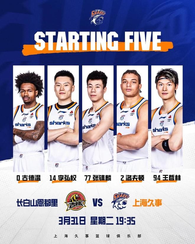 本場比賽,上海男籃派出王哲林、張鎮(zhèn)麟、李弘權(quán)和雙外援古德溫、洛夫頓的先發(fā)陣容。