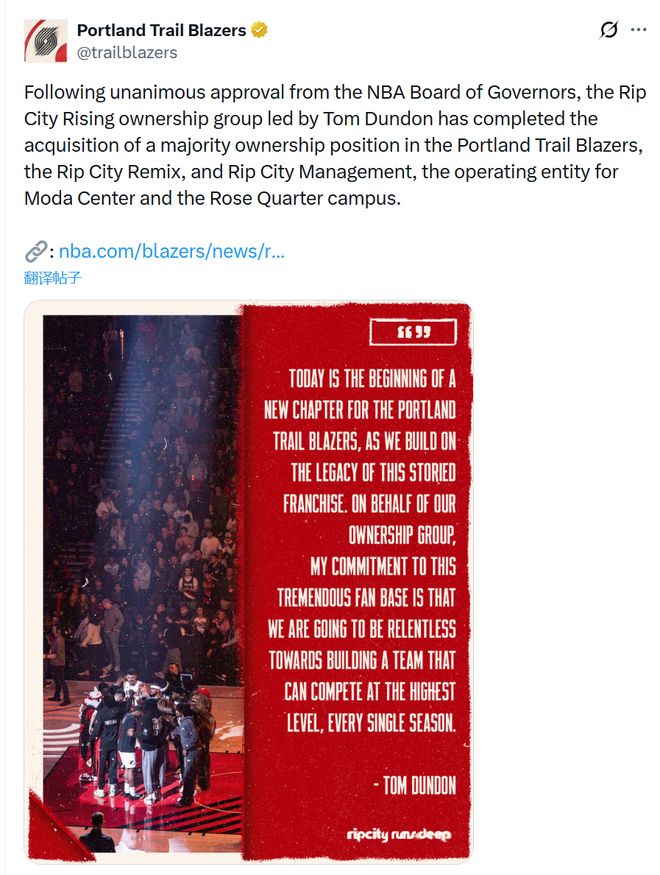 就在今天,開拓者隊官方官宣經NBA董事會批準,達拉斯億萬富翁湯姆·鄧頓所領導的Rip City Rising所有權集團已完成對波特蘭開拓者隊、Rip City Remix 和 Rip City Management(摩達中心和玫瑰花園園區(qū)的運營實體)的多數股權收購。