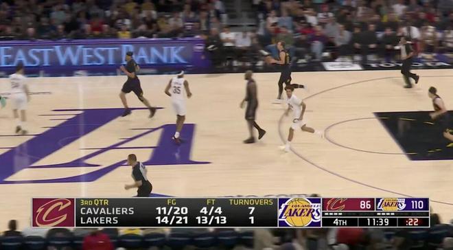 第三節(jié)湖人進(jìn)攻徹底爆發(fā),打了對手45-30攻擊波,直接將領(lǐng)先優(yōu)勢擴(kuò)大到27分,騎士對此似乎放棄了比賽,末節(jié)開局上了一套替補(bǔ)陣容。