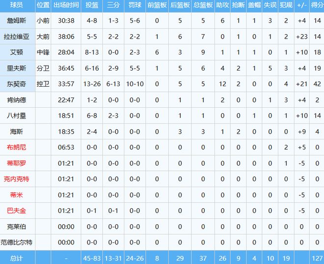 去年休賽期以兩年1200萬美元加盟湖人的拉拉維亞表現(xiàn)出色,此役首發(fā)出戰(zhàn)約38分鐘,投籃5中5,其中三分2中2,罰球2中2,以100%命中率貢獻(xiàn)14分7板,正負(fù)值+23冠絕全場。