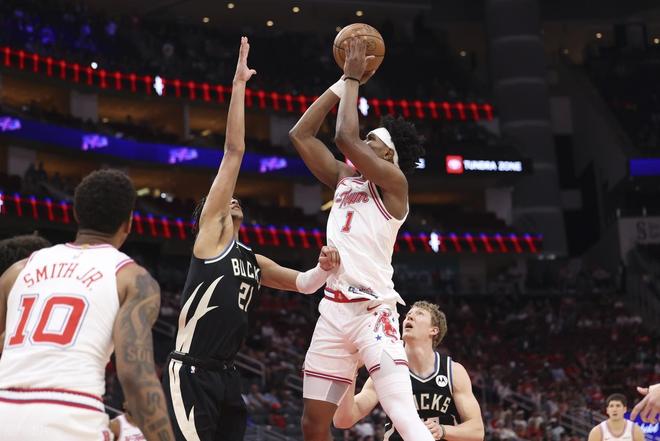首節(jié)開局,火箭連得4分,格林三分命中,但火箭這邊進攻節(jié)奏很快,阿門點給杜蘭特打進10-5,雄鹿暫停。回到比賽,火箭還是保持著領先優(yōu)勢,申京籃下打進,伊森三分,卡佩拉補籃,火箭領先到了兩位數(shù)。但烏度卡換下謝潑德,雄鹿包夾杜蘭特,火箭進攻突然啞火,被對手連續(xù)追分,第一節(jié)結束雄鹿20-27落后7分。
