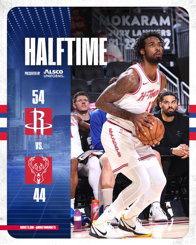 火箭隊(duì)的謝潑德上半場得到15分,湯普森得到8分和8個籃板;雄鹿隊(duì)的吉昂得到16分、6個籃板和5次助攻,南斯得到12分。