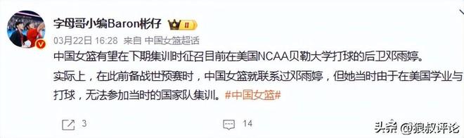 中國女籃方面,有媒體人報道,她有望在下期集訓(xùn)時征召目前在美國NCAA貝勒大學(xué)打球的后衛(wèi)鄧雨婷。