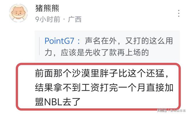 十分有意思的是,有些球迷紛紛留言表示?!斑€是祝他能順利拿到工資吧”;“前面那個沙漠里胖子比這個還猛,結(jié)果拿不到工資打完一個月直接加盟NBL去了”;“希望能順利拿到工資,別到時候來個互聯(lián)網(wǎng)討薪”……