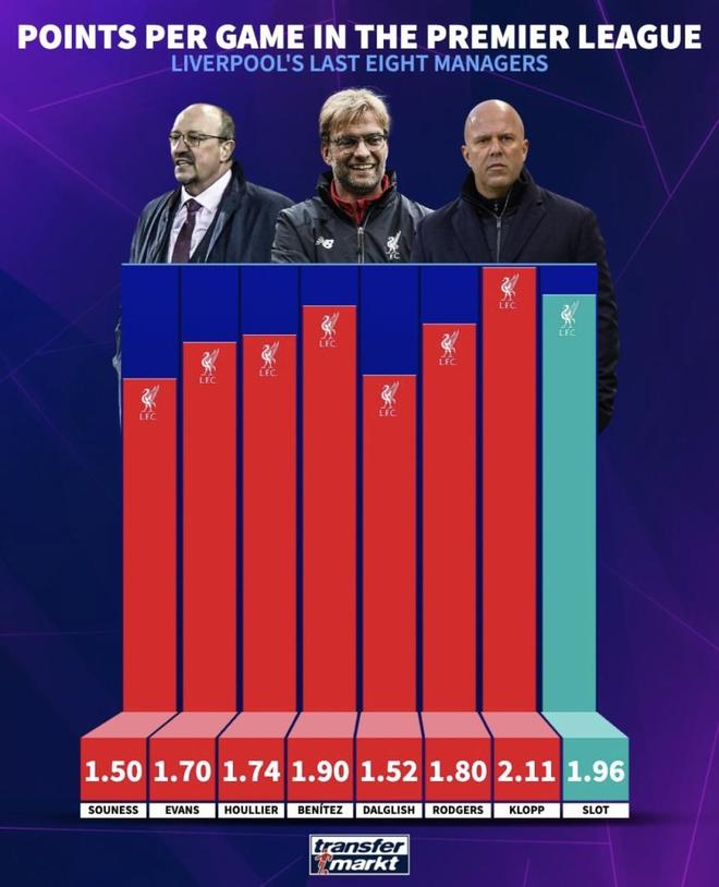 最近德國轉會市場發(fā)布了利物浦近8任主帥英超場均積分排名??寺迤找?.11分排在第一,斯洛特1.96分排在第二,貝尼特斯1.90分排在第三,后面幾位主帥的數據也咬得很緊。只看英超場均積分,先后順序已經擺出來了;可把冠軍數量、接手時的球隊狀態(tài)和最近的帶隊表現一起放進來,這幾個人排在一起,誰的分量更足?