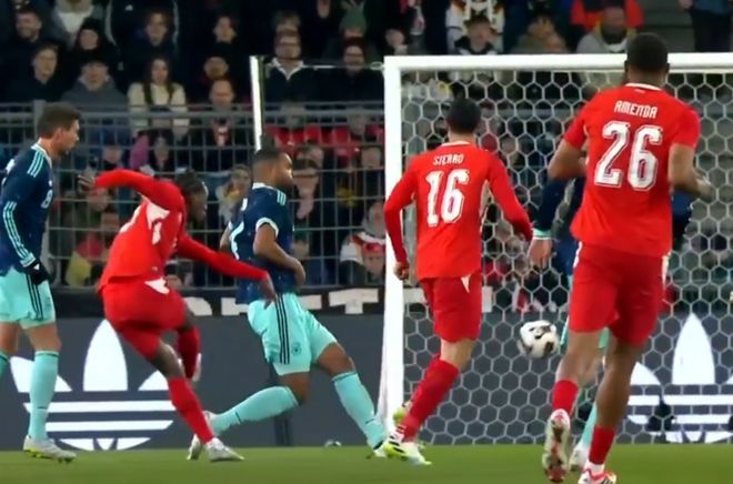 比賽開(kāi)始不久,哈弗茨就獲得了非常好的機(jī)會(huì),他近距離鏟射,結(jié)果門(mén)將把球擋了出去。第17分鐘,瑞士進(jìn)球了!恩多耶在禁區(qū)左側(cè)強(qiáng)行晃開(kāi)角度,小角度勁射,皮球應(yīng)聲入網(wǎng)!3分鐘后,格雷茨卡禁區(qū)內(nèi)倒地射門(mén),踢高了。第27分鐘,德國(guó)隊(duì)扳平比分!維爾茨在左側(cè)起球傳中,約納坦-塔后點(diǎn)包抄,頭球頂進(jìn)。