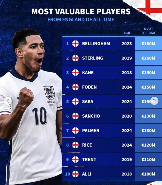- 德轉(zhuǎn)英格蘭球員歷史身價(jià)榜:貝林1.8億歐第1,斯特林1.6億第2
