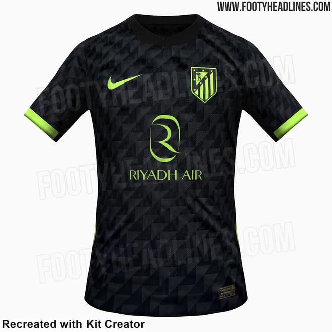 這款球衣在深色底衫上加入了微妙的幾何紋理,由重復三角形組成,形成現(xiàn)代感的鋸齒效果,胸部與袖子均有延展。黑色圓領簡約大方,袖口和側面面板使用熒光綠色邊飾,與耐克Logo、贊助商Riyadh Air以及馬競徽章的熒光綠相呼應,整體呈現(xiàn)高度統(tǒng)一的單色美感。