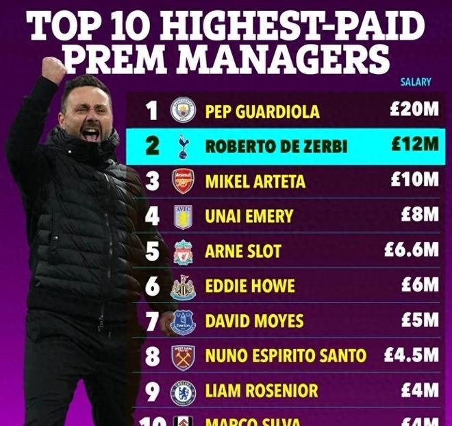 據英國媒體披露,德澤爾比的年薪高達 1200萬英鎊。這一數字不僅刷新了熱刺隊史記錄,也直接“碾壓”了多位爭冠及爭四行列的主帥。