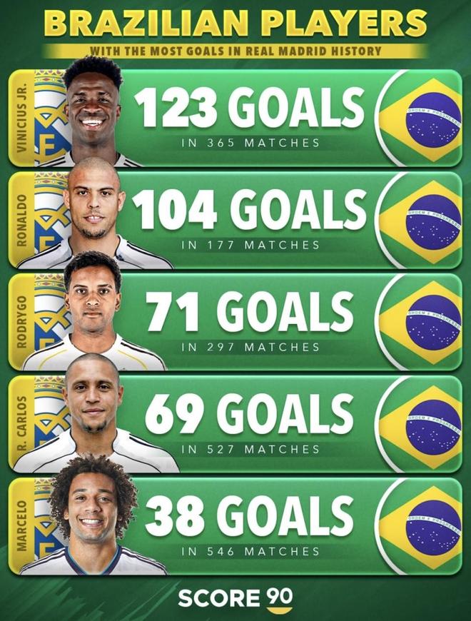 巴西球員在皇馬隊(duì)史進(jìn)球榜