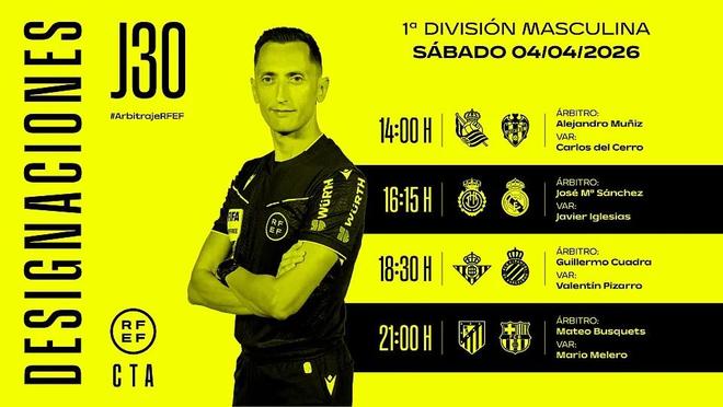 西班牙足協(xié)官方公布了周六西甲4場比賽的裁判安排,馬特奧-布斯克茨將執(zhí)法馬德里競技vs巴塞羅那。